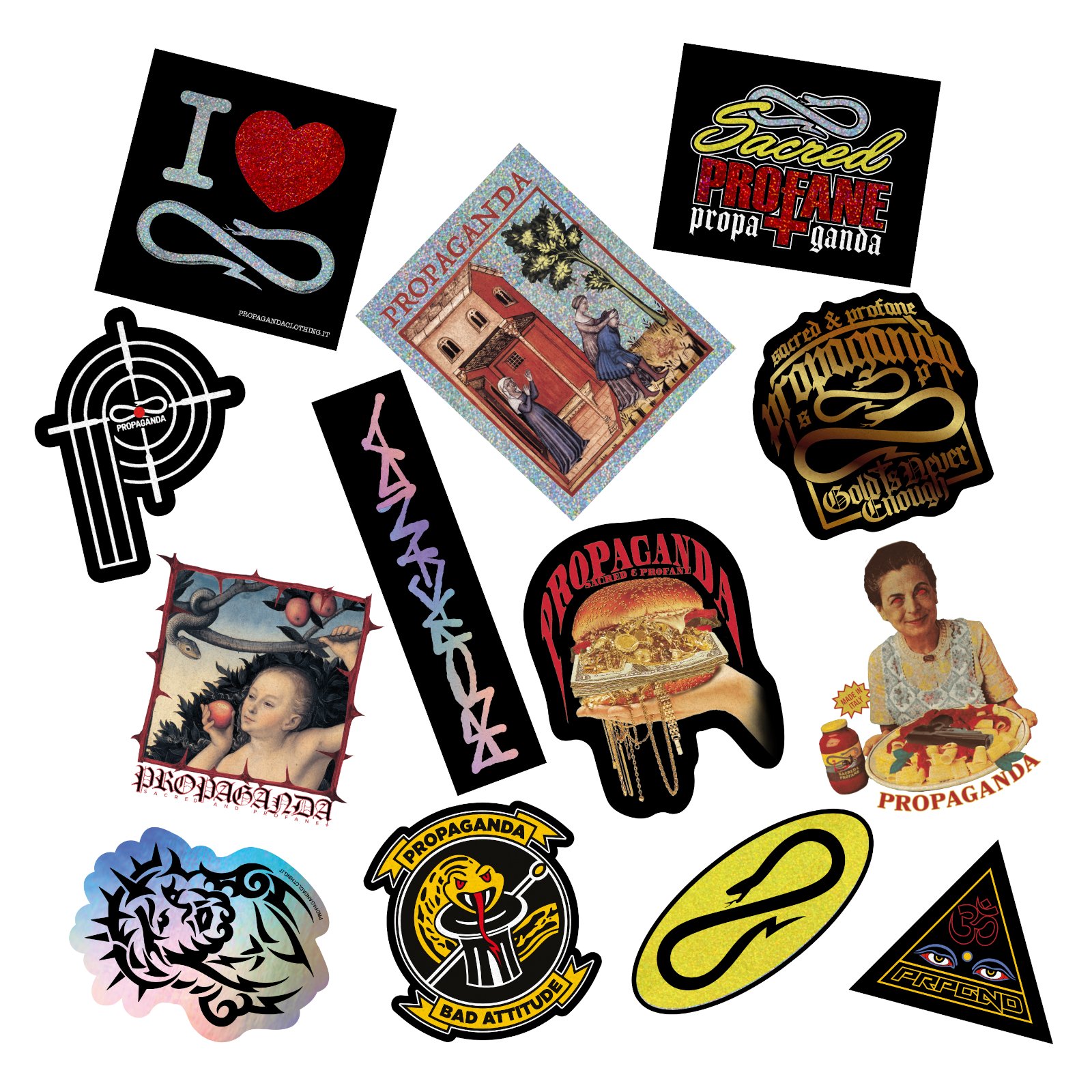 Adesivi celebrativi della nuova collezione “Sacred and Profane”. Vinile monomerico con laminazione lucida. Stampa serigrafica a colori fustellata. 13 adesivi assortiti.