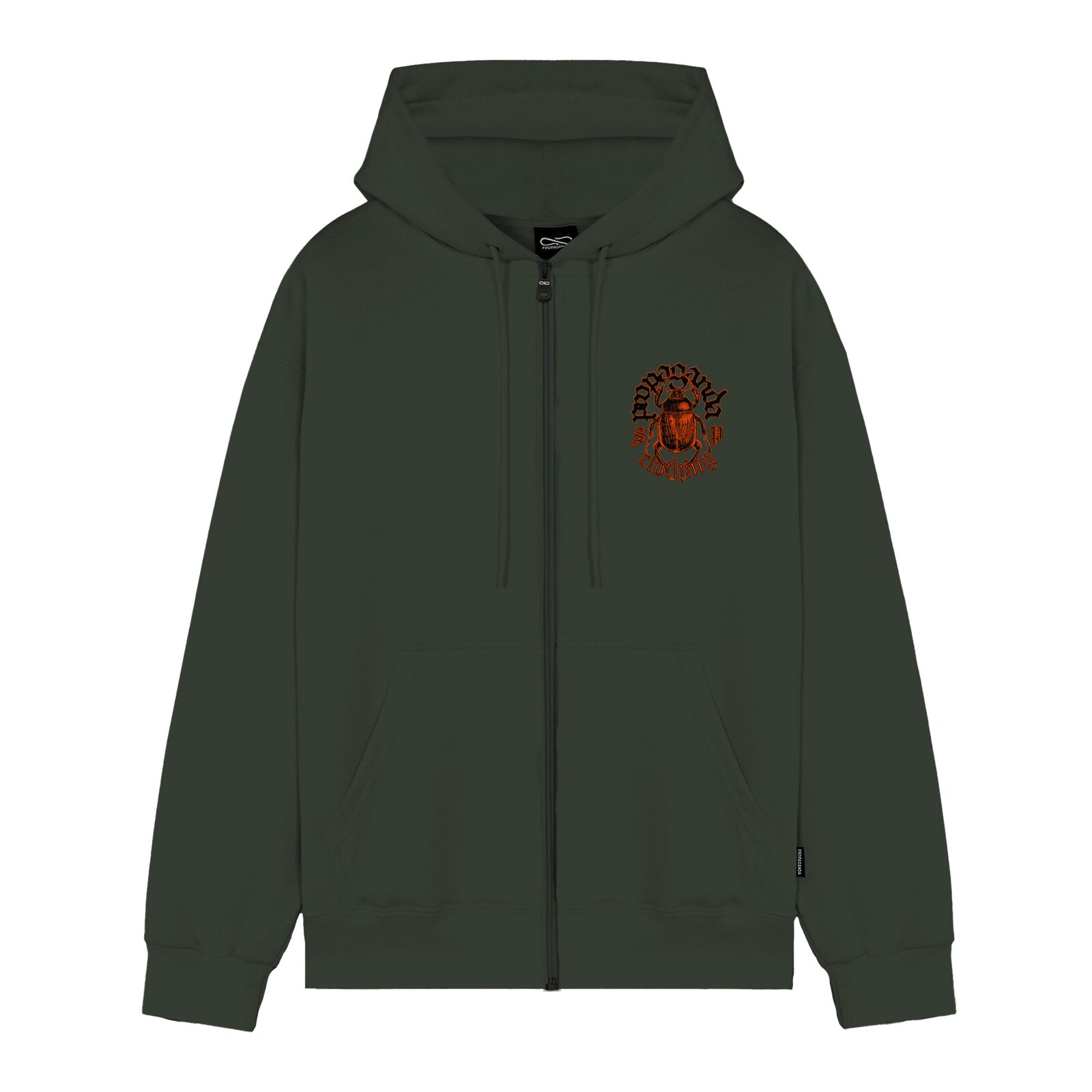 Felpa con cappuccio in Cotone. Zip verticale. Stampa serigrafica su fronte retro. Tasca a marsupio. Coulisse al collo. Costina ai polsi e in vita. Label personalizzata al fianco sinistro. 100% Cotone Made in Italy.