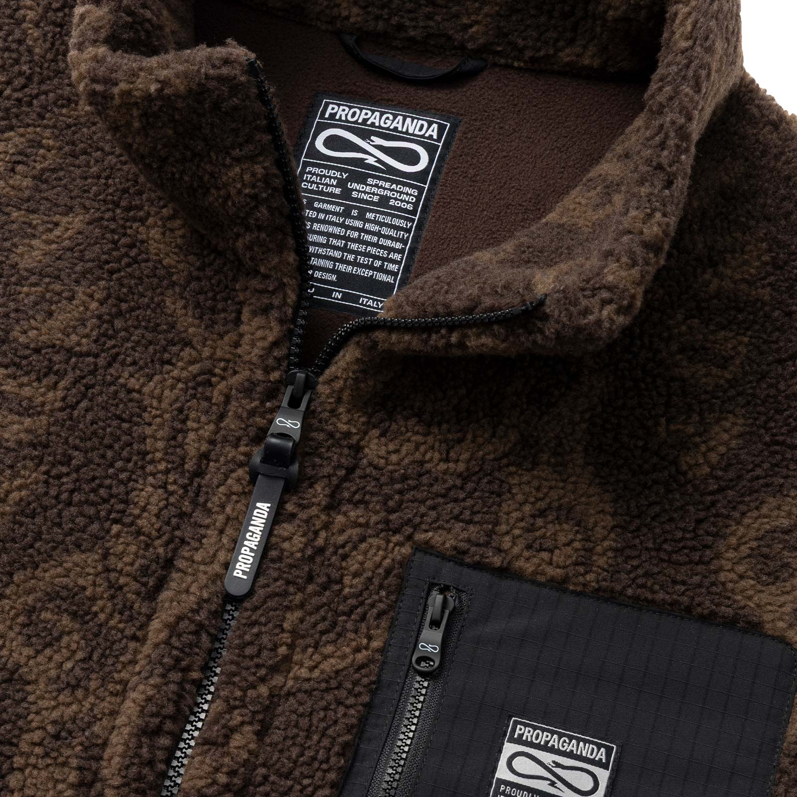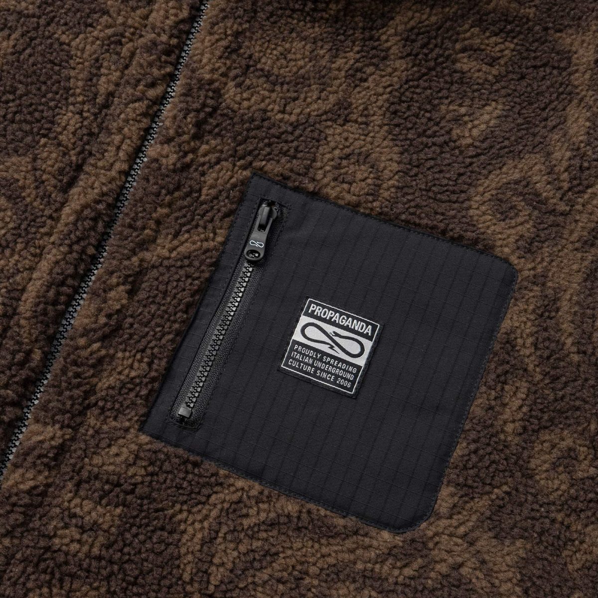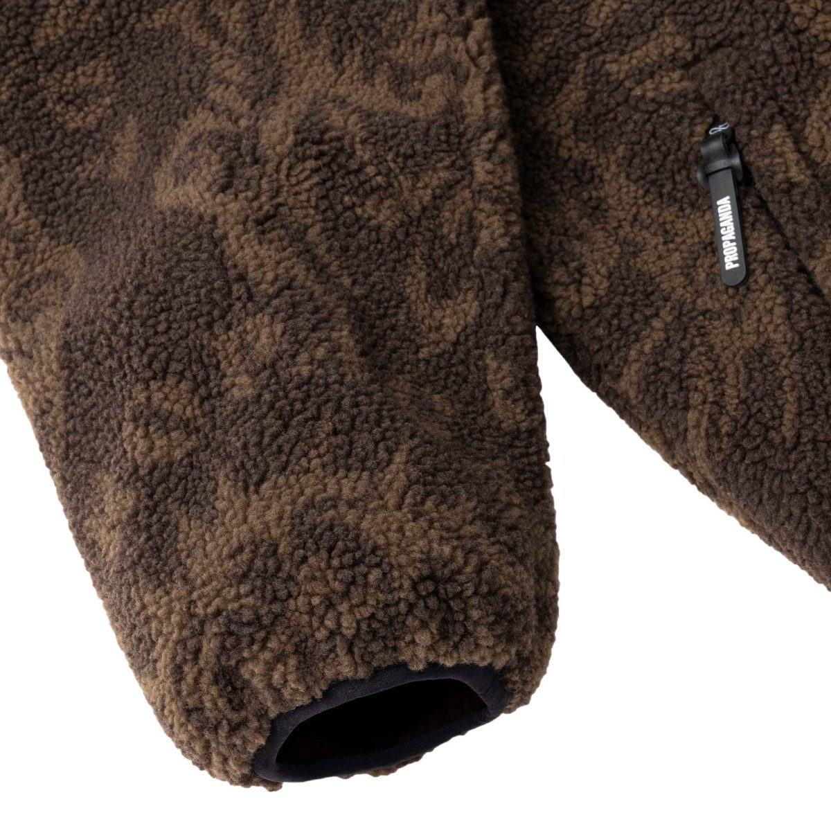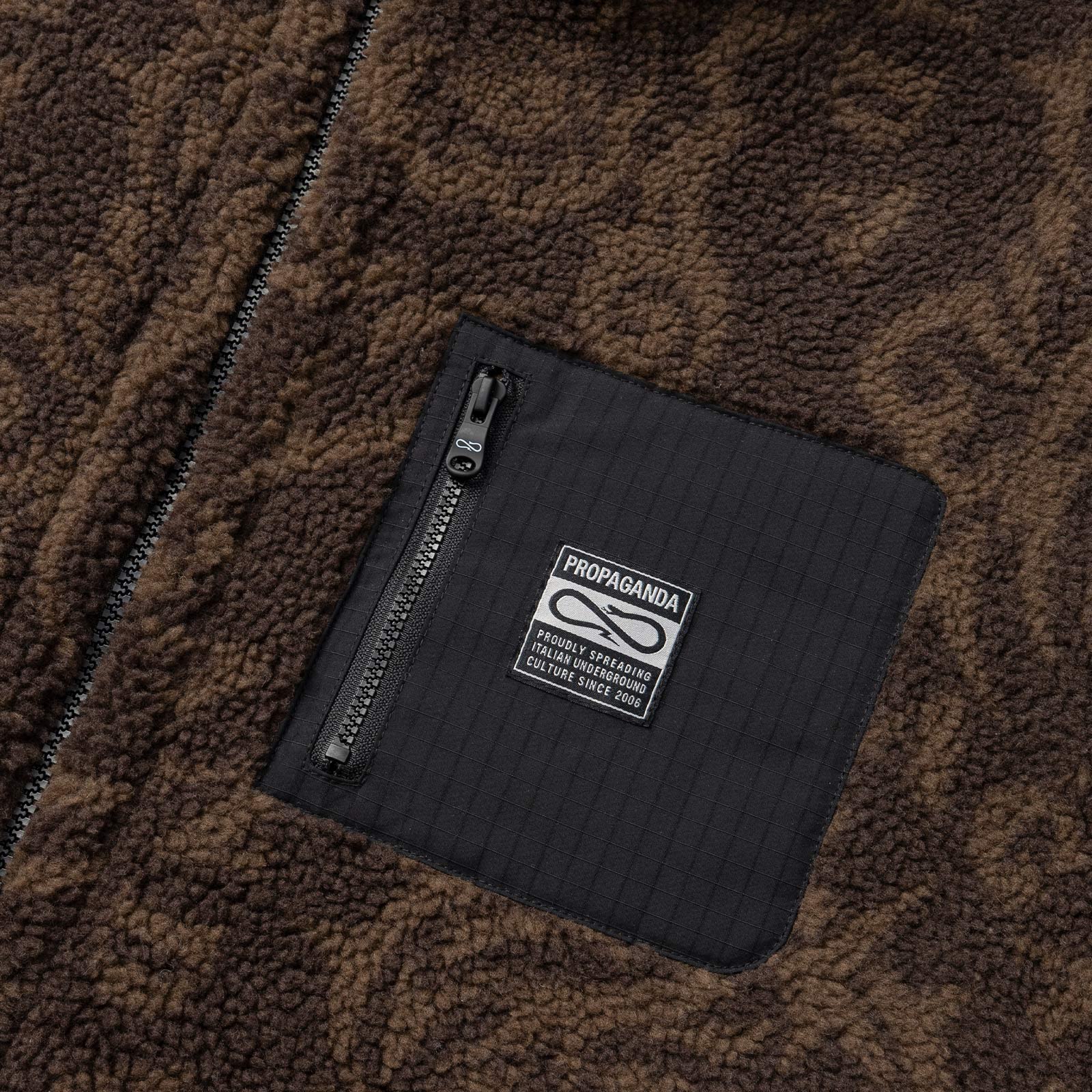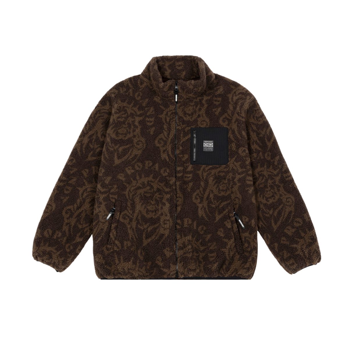 Sherpa jacket. Pattern “Sacred” jacquard stampato all-over. Taschino frontale applicato con woven label. 100% Poliestere.
